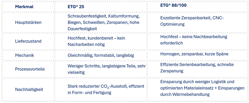 ETG ist ein Konzept für moderne, effiziente Fertigung. Ein Werkstoff, der Festigkeit und Bearbeitbarkeit vereint. Ein Stahl, der sich nicht zwischen Performance und Prozesssicherheit entscheiden muss.